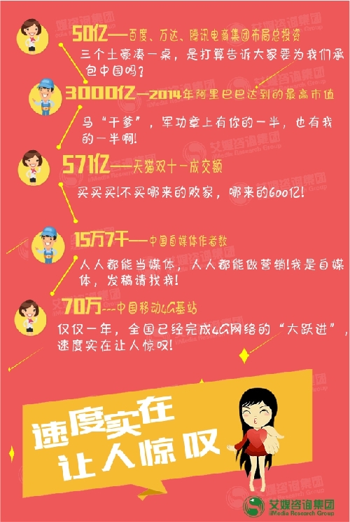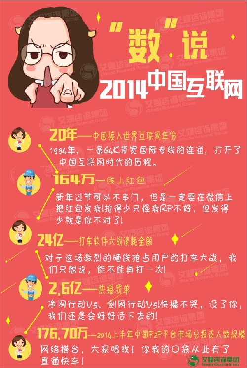 ????2014年接近尾聲,到了年末,是時(shí)候盤點(diǎn)一下2014年中國互聯(lián)網(wǎng)的發(fā)展了。2014年,是中國接入世界互聯(lián)網(wǎng)20周年,打車應(yīng)用補(bǔ)貼大戰(zhàn)消耗24億元;而微商、紅包、P2P等成為互聯(lián)網(wǎng)行業(yè)熱門詞匯;展望2015年的發(fā)展趨勢,移動(dòng)網(wǎng)民浸透率會(huì)得到怎么樣的提升?中國可穿戴設(shè)備會(huì)如何發(fā)展呢?(內(nèi)容轉(zhuǎn)自艾媒咨詢)