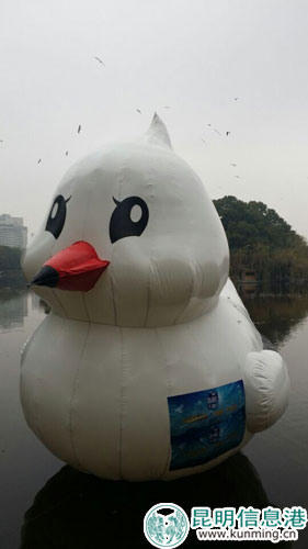 ????海鷗是昆明人的“老朋友”,自1985年以來,每年冬季與海鷗的約定,已成為昆明人最美好的情愫。1月1日一早來翠湖公園迎新年元旦的市民和游客多了一個驚喜,在翠湖公園東湖灘上多了一個高5米、腹部直徑5米,總重達700多公斤的“大海鷗”。這只“大海鷗”通體幾乎都用了白色,唯有嘴巴通紅,又大又黑的眼睛非常呆萌,外形設計取材于每年飛臨昆明的紅嘴鷗,它體型憨態(tài)可掬,頭部后方一撮向上飛揚的羽毛,讓“大海鷗”在呆萌中又不失靈動。