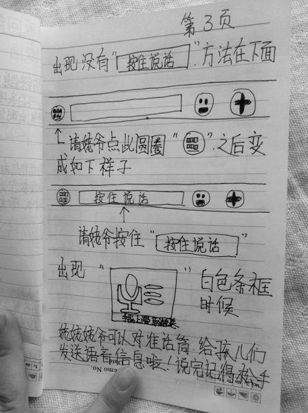 先看看這幾張說明書吧:清晰地標(biāo)注著頁碼的紙片上,寫滿了密密麻麻的圖形和符號(hào),附在旁邊的“說明”中,親切地寫著:“姥姥姥爺請(qǐng)按住……”“姥爺點(diǎn)此圓圈……”,圖形、圖例之間還按網(wǎng)上流行的箭頭一步一步進(jìn)行了標(biāo)示。一個(gè)對(duì)微信懵懂的人,參照這些圖例和說明,至少也能了解個(gè)大概了。主人公李璐,現(xiàn)居承德,剛剛大學(xué)畢業(yè),目前正在家準(zhǔn)備執(zhí)業(yè)律師考試。據(jù)悉,這對(duì)八旬老人雖有四個(gè)女兒,但兩個(gè)女兒在北京居住,另一個(gè)在石家莊工作,雖說有李璐的媽媽同城照顧,但因?yàn)楣ぷ髅β?,平時(shí),老兩口多是獨(dú)自生活。隨著年齡增長,老人比過去更加想念在各地工作的女兒,想女兒的時(shí)候老人就看看孩子們的照片。外甥女李璐非常理解姥姥姥爺?shù)男乃迹龑?duì)記者說:“雖然平常姨姨們都很孝敬姥姥姥爺,經(jīng)常打來電話聯(lián)系,但是卻看不到彼此的樣子。微信有聲音,又能發(fā)圖像,還不花錢,我就想讓姥姥姥爺也學(xué)會(huì)?!彪娫捓铮浾吣芨械竭@位年輕女孩話語里滿含羞澀。