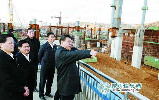 20日,習(xí)近平來到正在建設(shè)中的昆明火車南站,詳細(xì)了解工程設(shè)計(jì)和施工進(jìn)度 新華社 圖