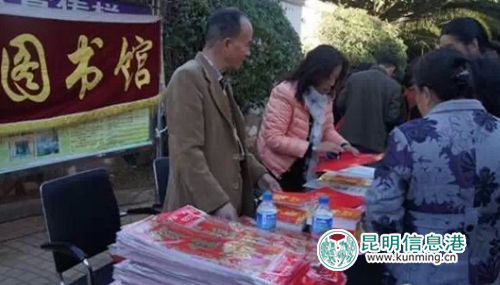 ????1月26日,在官渡區(qū)圖書館姚館長的帶領(lǐng)下,區(qū)圖書館宣輔部工作人員到關(guān)上街道文化站贈(zèng)送圖書,在官渡廣場為廣大市民送去門神、農(nóng)家歷、對(duì)聯(lián),并贈(zèng)送精美的書簽、窗花和宣傳冊(cè),同時(shí),還邀請(qǐng)書法家現(xiàn)場免費(fèi)為市民書寫春聯(lián)。