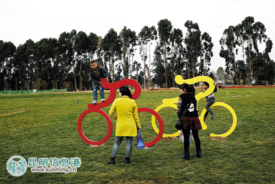 ????大草坪上有3個運動員騎自行車的雕塑,但他們卻成為游客,靠著、杵著、爬著合影的工具。