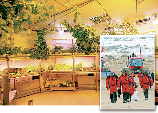 大圖:中山站溫室實驗室內(nèi)蔬菜生長情況。小圖:隊員凱旋。