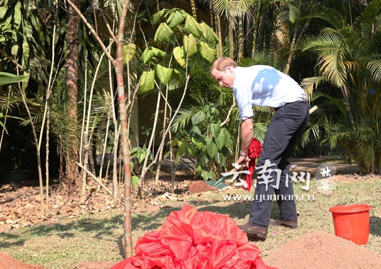 ????此后,在工作人員的引導(dǎo)下,威廉王子來到距離飛利浦親王手植望天樹20余米的地方,這里準(zhǔn)備了一棵約3米高,同樣作為熱帶地區(qū)特有植物的五椏果樹。威廉王子走到小樹前,提起鐵鍬鏟了幾鏟土蓋在了樹根上后,又從身后的一只紅色塑料桶內(nèi)舀出清水,一遍又一遍小心翼翼地澆在樹根上。隨后,威廉王子還與陪同人員一起為本次植樹的紀(jì)念碑進(jìn)行了揭幕。