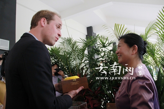 云南省人大常委會副主任刀林蔭向威廉王子贈送云南的茶葉。云南網(wǎng)記者念新洪/攝