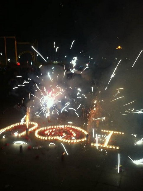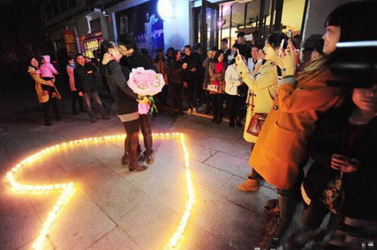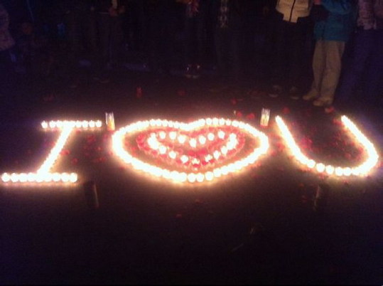 ????3月15日晚上,湖北經(jīng)濟學(xué)院門前廣場上的一幕吸引了不少人圍觀:幾百支蠟燭圍成一圈,一名男生手捧玫瑰花站在蠟燭當(dāng)中,只求女友回心轉(zhuǎn)意。