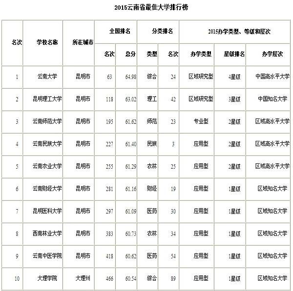 2015云南省最佳大學排行榜排在前10的高校。圖片來自中國校友會網