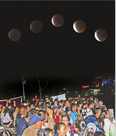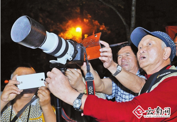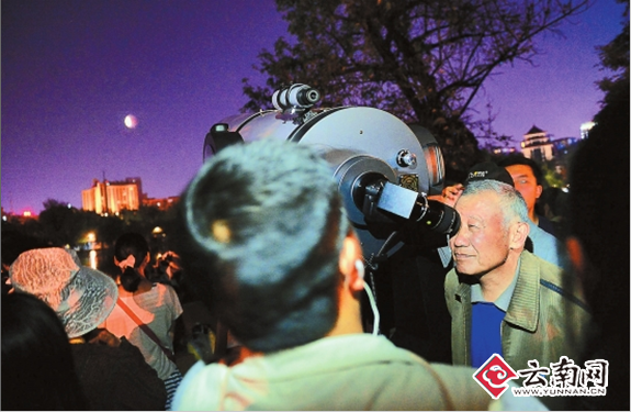 ????最熱鬧的還數(shù)大口徑天文望遠鏡旁邊。很多市民自發(fā)排隊,希望月全食開始時可通過望遠鏡看看“紅月亮”。該望遠鏡是云南省天文愛好者協(xié)會會員帶來的,專供市民觀測用。