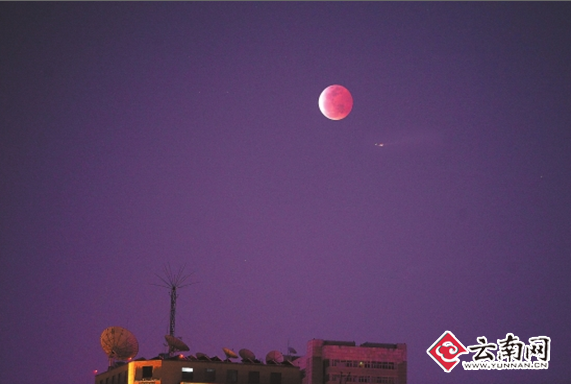 ????在眾人期盼中,19時55分左右,泛著紅光的月亮從翠湖賓館上方爬上來,慢慢上升越來越紅。到月全食時,整個月亮都變成紅色。市民忙掏出手機,記錄下“紅月亮”的身影。