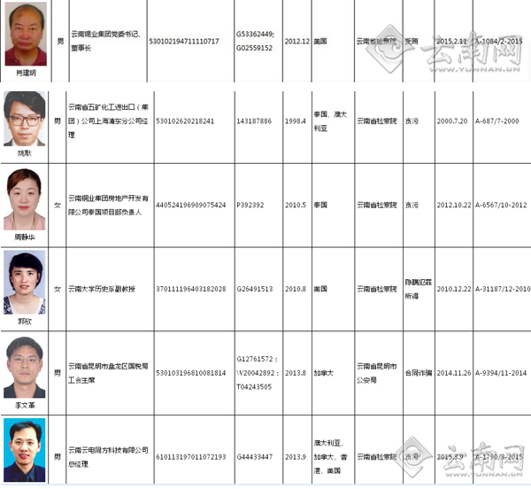 ????云南被紅色通緝的6人中,最早出逃的是原云南省五礦化工進(jìn)出口(集團(tuán))公司上海浦東分公司經(jīng)理姚耿,為1998年4月,可能逃往泰國、澳大利亞;最晚的為原云南云電同方科技有限公司總經(jīng)理張大偉,在2013年9月,可能逃往澳大利亞、加拿大、香港、美國。