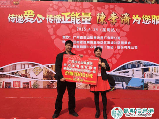 ??? 昆明信息港訊 記者張子源 4月24日上午,有著400余年歷史的廣州白云山陳李濟藥廠有限公司攜手昆明蘇家塘社區(qū)居委會、云南鴻翔一心堂藥業(yè)(集團)股份有限公司,在學府路協(xié)信天地共同舉行“傳遞愛心˙傳播正能量-陳李濟為您服務(wù)”昆明站社區(qū)公益活動。