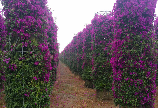 ????在宜良縣匡遠(yuǎn)鎮(zhèn)蘭家營建成的,占地面積近60畝的三角梅大型造形苗培植基地“為君開”里,共培植有1500個不同規(guī)格的三角梅花柱,其中最高大的葉子花柱直徑達(dá)1米,高度可達(dá)4米,可直接用吊車裝吊移栽到客戶需要的地方;此外,還有600株造型各異的三角梅樁景精品,和2萬多株球徑1.2米以上的三角梅球及100個寬3.2米、寬1.5米的三角梅景墻。