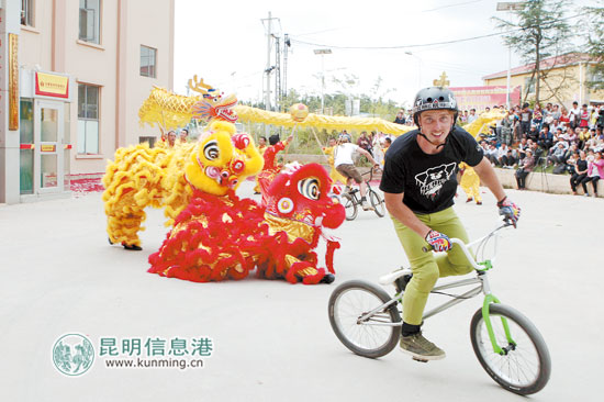 ????了解了端午節(jié)習俗的“理論”,午后就該“實踐”了。在“噼噼啪啪”的鞭炮聲響過之后,社區(qū)舞龍隊精神抖擻地沖到小廣場,一條金龍便活靈活現(xiàn)地展現(xiàn)在鄉(xiāng)親們面前,巨龍不斷變換造型,分別擺出“中國龍”的字樣,贏得陣陣掌聲。來自ACC極限運動俱樂部的外籍車手“小馬哥”和“青蛙王子”騎著小輪車“飛”進場中,開始了花式表演,他們輪番沖上“陡坡”,在空中旋轉(zhuǎn)兩三周后又沖了下來,鄉(xiāng)親們的心一下子懸到了嗓子眼兒,不時傳出尖聲驚叫,然后是雷鳴般的掌聲。
