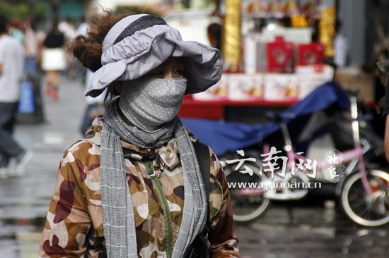 ????8月5日,昆明連續(xù)多日陣雨不斷,接連降雨導(dǎo)致地面低溫驟降。近日以來,昆明白天室外溫度多在20℃左右,最低氣溫甚至只有15℃,晝夜溫差近10℃。昆明當(dāng)?shù)厥忻裨诨馃嵯奶靺s“不勝清涼”,羽絨服、棉襖、圍巾、口罩、手套等“冬季裝備”紛紛上陣。