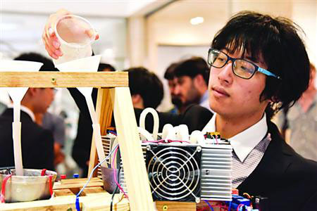 ????這臺機器由注水口、核心工作裝置和出水口組成。將常溫水順漏斗倒入,水通過導(dǎo)管進入由6片半導(dǎo)體和3臺風(fēng)扇組成的裝置。按下按鈕,水徐徐流出。集滿一杯,水溫僅8.5℃,而原來的水溫約有28℃。團隊負責(zé)人劉暢介紹,半導(dǎo)體通電后,能“吸”走水中熱能,同時加以風(fēng)扇散熱,水溫很快被降下來。目前這臺不用冰的“冰鎮(zhèn)飲料機”使用24伏電源,若設(shè)計為220伏家用交流電,1分鐘能將常溫水降至冰點。(記者 徐瑞哲 實習(xí)生 鄭子愚)