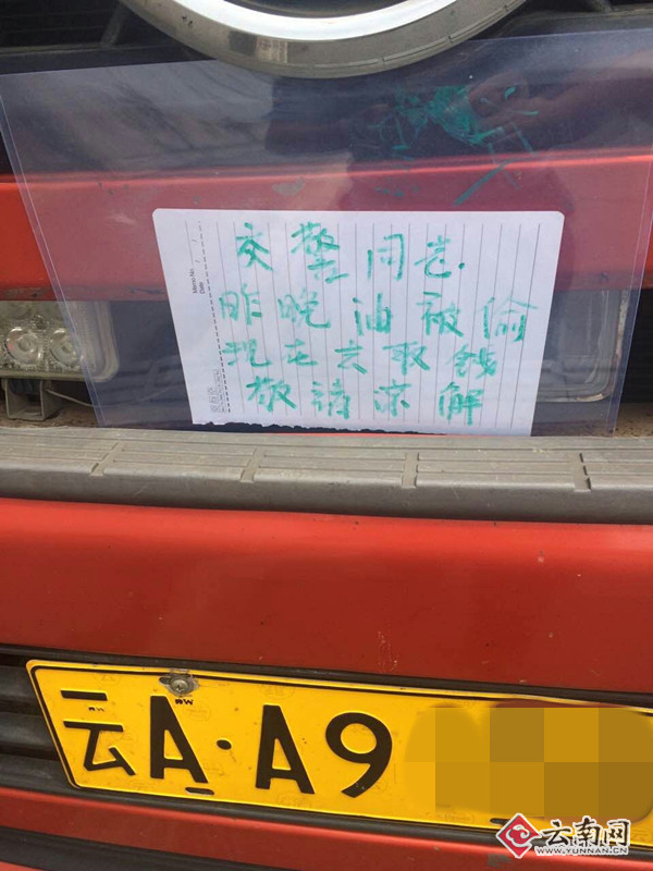 ????駕駛?cè)撕鷰煾蹈嬖V民警,他頭天晚上將車停在楚雄轄區(qū)的一個(gè)服務(wù)區(qū)休息,沒(méi)有想到,油箱里的油被偷了,他也向當(dāng)?shù)毓膊块T報(bào)了警。當(dāng)他駕車行駛到大理收費(fèi)站后,由于身上沒(méi)有帶錢,車輛出不了收費(fèi)站,于是他決定將車停在路邊,進(jìn)城去取錢。期間,他又怕交警遇到自己違法停車遭到處罰,就用張貼紙條這么一個(gè)方法請(qǐng)交警諒解自己的違法行為。