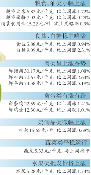 ??? 據(jù)省商務(wù)廳對我省243家超市、農(nóng)貿(mào)市場、屠宰企業(yè)監(jiān)測數(shù)據(jù)顯示:2015年8月24日~8月30日,我省生活必需品總體價(jià)格小幅上漲,市場貨源充足,市場運(yùn)行平穩(wěn)。所監(jiān)測的13大類商品中,呈11漲1跌1持平的態(tài)勢。 (春城晚報(bào) 記者曹婕)