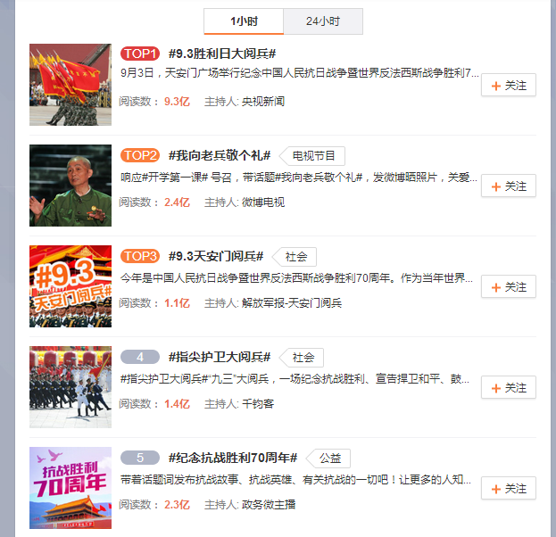 ???9月3日上午,新浪微博一小時(shí)內(nèi)熱門話題榜前十位,全部被抗戰(zhàn)勝利紀(jì)念相關(guān)主題占據(jù),微博前五位話題總閱讀量累計(jì)超過16億次。 微博截圖