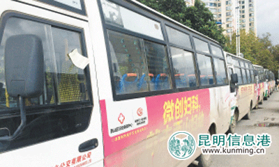 ????8日,昆明雙譽(yù)城鄉(xiāng)公交公司的6條公交線路的58輛公交車從西站公交車場(chǎng)開出,依次排在了虹山東路與滇緬大道交叉口路邊。
