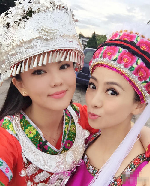 9月12日,李湘在微博曬出與翁虹身穿民族服飾的合影。