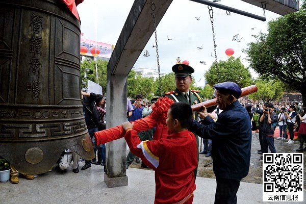 ????抗戰(zhàn)老兵代表撞響和平鐘。
