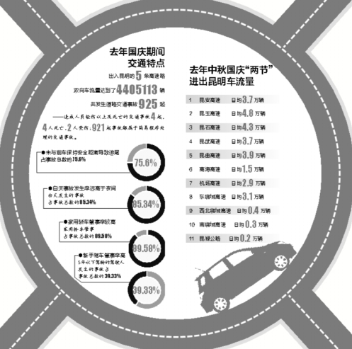 ????昆明信息港綜合整理 昨天,云南高支隊對去年國慶7天交通事故進行了統(tǒng)計,共有925起交通事故。其中,通過簡易程序處理的就有921起,5條進出昆明的高速路平均每天發(fā)生131起。????十一臨近,高支隊交警對往年情況分析后建議,10月1日、2日是出行高峰期,10月6日、7日為返程高峰期,請盡量回避高峰期;此外,有6大易擁堵的路段需要注意:昆曲高速烏龍立交、昆玉高速王家營立交(昆明往玉溪方向)、昆玉高速北城立交、昆石高速科技園立交(石林往昆明方向)、昆楚高速碧雞隧道(安寧往昆明方向)、高峣立交(南連接線高速公路往昆明安寧方向)。