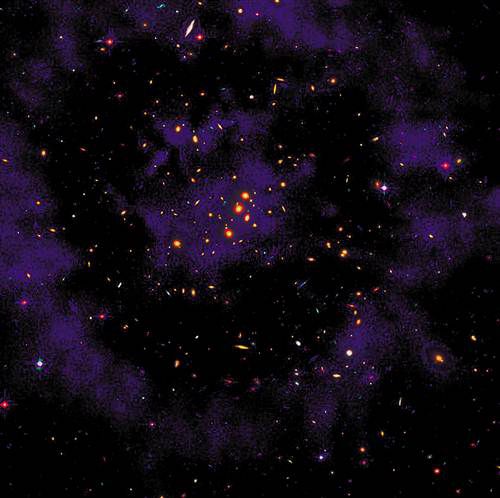 ????這張由哈勃太空望遠(yuǎn)鏡拍攝的照片顯示的是太空中一個(gè)跨度約為260萬(wàn)光年的暗物質(zhì)環(huán)。