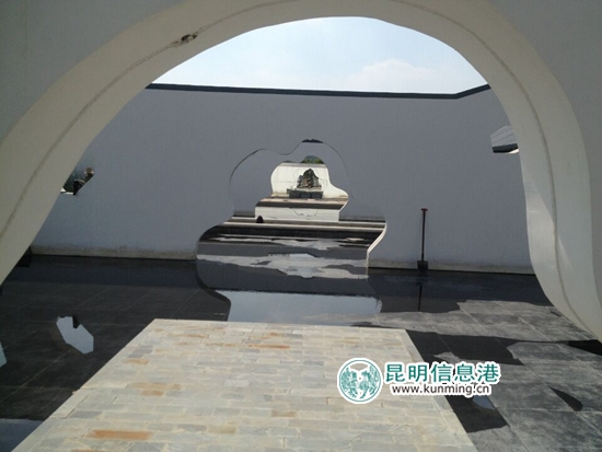 ????進(jìn)入昆明園,首先映入眼簾的便是“一顆印”的建筑剪影,園區(qū)內(nèi)利用景墻的高低起伏,立面裝飾與景窗開洞,營造了昆明“一顆印”傳統(tǒng)民居的立面效果。而入口處迎面的外圈墻采用云南當(dāng)?shù)氐奶厣幕鹕綆r貼面,形態(tài)上寓意“一顆印”民居的庭院圍墻,而內(nèi)部的白墻高低起伏,模仿了民居主體的屋脊線,墻上星星點(diǎn)點(diǎn)的小景窗則是展現(xiàn)了主要以天井采光的一顆印建筑外立面上的小窗戶。園中主要游路由一條青石板鋪成而成,每一塊青石板面均是以傳統(tǒng)手法人工手鑿而成,走在這狹窄的巷道里,踩著腳下這頗具昆明特色的石板路,望著兩側(cè)的一顆印剪影,使人仿佛置身上世紀(jì)昆明老街。