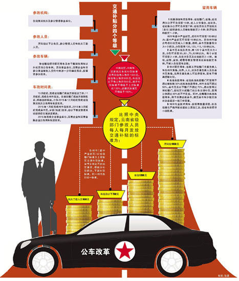 ??? 昆明信息港綜合整理 今年12月底前,云南省級黨政機關(guān)要基本完成公務(wù)用車改革。昨日上午,云南召開公務(wù)用車制度改革媒體政策解讀會,透露云南公務(wù)用車制度改革總體方案及配套文件于8月11日獲中央批復(fù),全省公務(wù)用車改革已進(jìn)入全面實施階段。本輪車改,以取消一般公務(wù)用車,普通公務(wù)出行實行社會化提供并適度補貼交通費用為原則,僅可留用機要通信、應(yīng)急等五類定向化保障車輛。其中省級機關(guān)公務(wù)用車削減幅度最大,超過70%。改革后,全省整體和省本級公務(wù)用車總支出將均比改革前降低7%以上。
