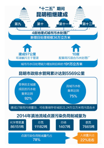 ????“十二五”期間,昆明相繼建成第九、十、十一、十二4座地埋式城市污水處理廠,新增日處理規(guī)模36萬立方米,使城市污水處理廠達到12座,出水水質(zhì)均達到一級A標準。 同時,建成97公里環(huán)湖截污主干管渠及10座配套雨污混合污水處理廠,城市污水日處理能力由“十五”末的55.5萬立方米,增加到目前的191萬立方米。