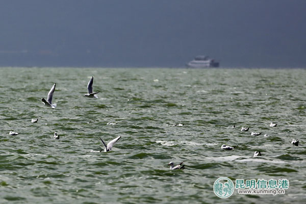 ?紅嘴鷗飛翔在滇池上。資料圖片