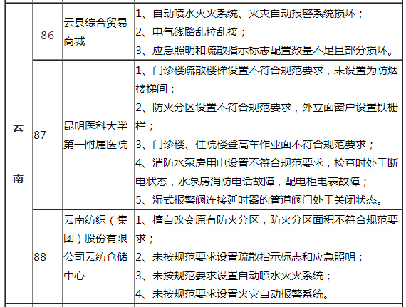 ????由于門診樓疏散樓梯設(shè)置、防火分區(qū)設(shè)置、登高車作業(yè)面、消防水泵房用電設(shè)置不符合規(guī)范要求,及濕式報警閥連接延時器的管道閥門處于關(guān)閉狀態(tài)等原因,云南省昆明醫(yī)科大學(xué)第一附屬醫(yī)院存重大火災(zāi)隱患。另外,云縣綜合貿(mào)易商城及云南紡織(集團)股份有限公司云紡倉儲中心因自動噴水滅火系統(tǒng)、火災(zāi)自動報警系統(tǒng)損壞等原因被列入榜單。