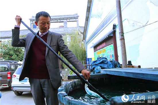 白族扎染技藝傳承人段樹坤向記者展示染缸內的染布 記者薛丹/攝