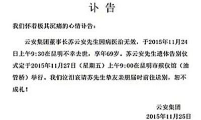 ????記者向大堂工作人員詢問,工作人員讓記者聯(lián)系一名副總,得知蘇云安的家屬及公司領導都在昆明市殯儀館油管橋服務站處理善后事宜。家屬不愿意接受采訪,云安集團除發(fā)布訃告外對此事未作回應。