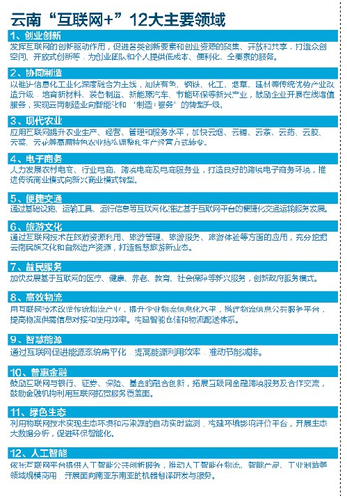 云南是傳統(tǒng)資源大省,主要依靠資源要素投入、規(guī)模擴張的粗放發(fā)展模式,已不適應新常態(tài)下發(fā)展的要求,亟需轉變發(fā)展方式。為此,意見中提出,全省要形成更廣泛的以互聯(lián)網(wǎng)為基礎設施和創(chuàng)新要素的經(jīng)濟社會發(fā)展新形態(tài),突出 “互聯(lián)網(wǎng)+”創(chuàng)業(yè)創(chuàng)新、協(xié)同制造、現(xiàn)代農(nóng)業(yè)、電子商務、便捷交通、旅游文化、益民服務、高效物流、智慧能源、普惠金融、綠色生態(tài)、人工智能12個主要領域。