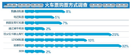 ????對于一票難求的春運,不少朋友通過移動網(wǎng)絡找到了解決方法。在購票成功的用戶中,利用搶票軟件及12306官方網(wǎng)站購票的用戶占51%,此外,有25%的用戶表示可以通過易信等移動社交軟件的群功能增加購票成功率。