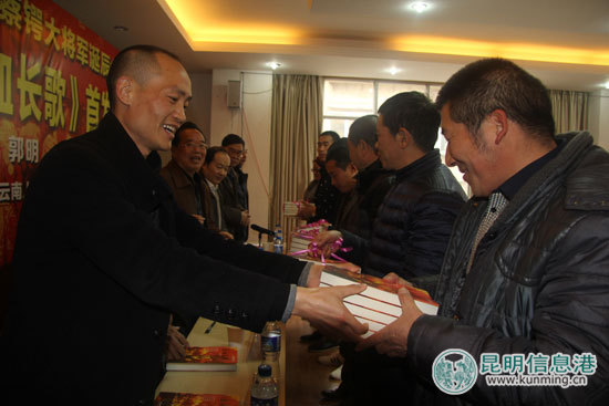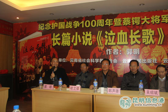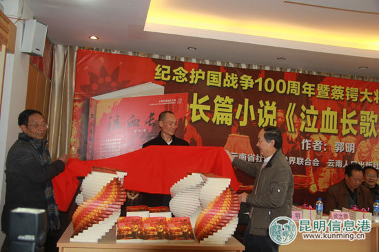 ????昆明信息港訊 記者李紅鸞 12月31日,由青年作家、云南省紀(jì)實(shí)文學(xué)學(xué)會(huì)常務(wù)副會(huì)長(zhǎng)兼秘書長(zhǎng)郭明創(chuàng)作的護(hù)國(guó)運(yùn)動(dòng)題材長(zhǎng)篇小說《泣血長(zhǎng)歌》在昆首發(fā)。首發(fā)式由云南省社會(huì)科學(xué)界聯(lián)合會(huì)、云南人民出版社、云南省紀(jì)實(shí)文學(xué)學(xué)會(huì)共同主辦,省委宣傳部新聞閱評(píng)專家組組長(zhǎng)、云南省紀(jì)實(shí)文學(xué)學(xué)會(huì)會(huì)長(zhǎng)韓聲雄主持。來自中共云南省委宣傳部、省社科聯(lián)、省作家協(xié)會(huì)、云南大學(xué)、云南人民出版社、昆明市文藝評(píng)論家協(xié)會(huì)等有關(guān)單位領(lǐng)導(dǎo)及各界人士出席首發(fā)式。云南省作家協(xié)會(huì)副主席楊紅昆、云南省作家協(xié)會(huì)原副主席兼秘書長(zhǎng)歐之德為《泣血長(zhǎng)歌》一書揭幕。