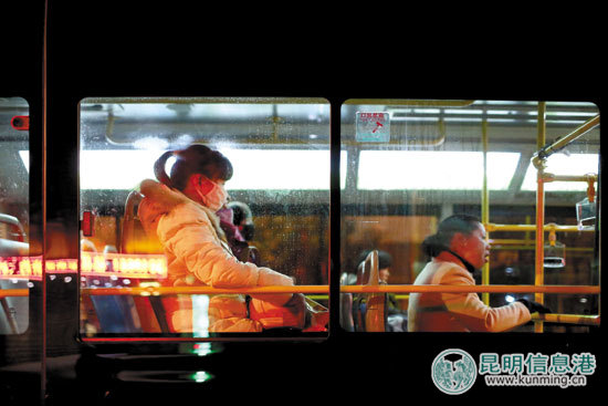 ????公交車最后一排的座位上,并排坐著一對情侶。女生瞇著眼睛,戴著耳機(jī),看向還漆黑一片的窗外。男生時而低頭打盹,時而望向窗外,像是擔(dān)心錯過了下車的車站。這對情侶趕早班車前往東部客運(yùn)站,準(zhǔn)備回曲靖老家和家人團(tuán)聚。