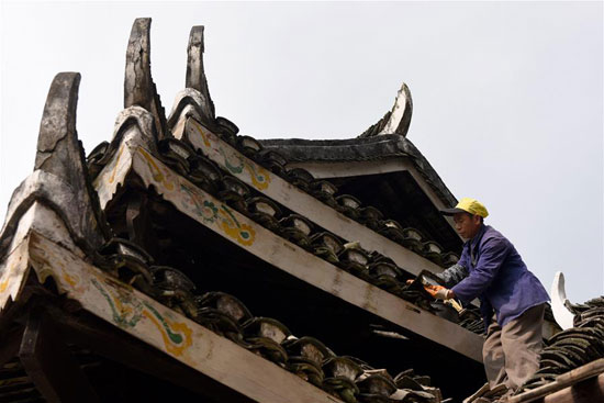 ????1月4日,一名侗族群眾在三江侗族自治縣林溪鎮(zhèn)程陽永濟橋面上拆卸舊瓦片。
