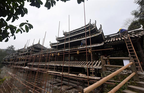 ????1月4日,侗族群眾在三江侗族自治縣林溪鎮(zhèn)程陽永濟橋搭建腳手架。