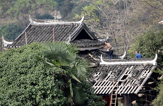 1月4日,侗族群眾在三江侗族自治縣林溪鎮(zhèn)程陽永濟橋面上拆卸舊瓦片。