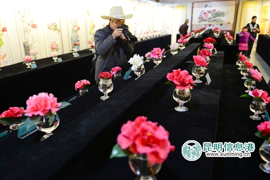 ????花朵園里展出的山茶花大多根莖較短,盛裝的容器不再是花瓶,而換成一個個透明的酒杯。杯中之物不是酒,而是能讓花朵持續(xù)保鮮的營養(yǎng)液。營養(yǎng)液同樣清澈如水,茶花盛開在酒杯之上顯得更加高貴動人。望著眼前嬌艷盛開的各式茶花,許多市民都忍不住拿出手機、相機,捕捉茶花的嬌姿靚影。有的市民盡力蹲下身子,只為把臉頰與花朵貼的更近一些,與這些小花留下合影。