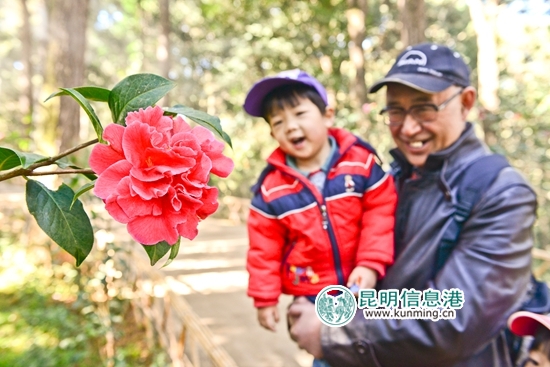 ????開幕儀式結束后,游客紛紛來到花朵園展區(qū)。這里展出的數(shù)十個品種的300余朵茶花開得正好。據(jù)金殿名勝區(qū)主任李溯介紹,本次花展期間,金殿自主培育的“鳴鳳”山茶系列11個家族成員除了在公園內(nèi)各處盛開,其中7個品種還在花朵展中單獨亮相,包括去年底剛剛培育出,由市民投票命名的“鳴鳳緋鶴”。