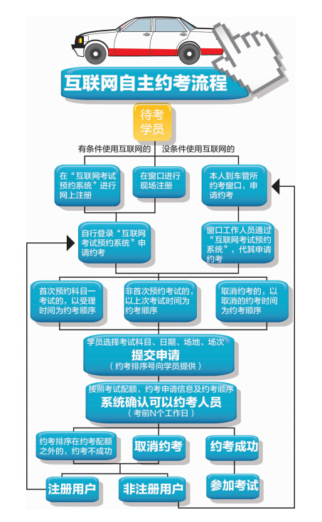 ????3考生按照車管所已公布的考試預(yù)約計(jì)劃,可以通過(guò)互聯(lián)網(wǎng)、電話、車管窗口等方式,自主選擇考試時(shí)間、地點(diǎn)預(yù)約考試。