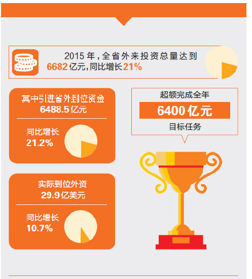 ????在去年初出臺(tái)的穩(wěn)增長(zhǎng)措施推動(dòng)下,部分州市招商引資下滑趨勢(shì)得到及時(shí)扭轉(zhuǎn)。2015年,全省外來(lái)投資總量達(dá)到6682億元,同比增長(zhǎng)21%,超額完成全年6400億元的目標(biāo)任務(wù),其中引進(jìn)省外到位資金6488.5億元,同比增長(zhǎng)21.2%;實(shí)際到位外資29.9億美元,同比增長(zhǎng)10.7%。