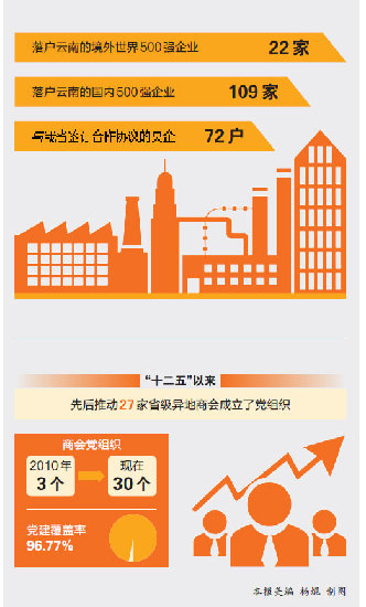 ????省招商合作局進(jìn)一步加強(qiáng)和改進(jìn)對(duì)省級(jí)異地商會(huì)的指導(dǎo)和服務(wù),印發(fā)《云南支持外來(lái)投資企業(yè)創(chuàng)業(yè)創(chuàng)新發(fā)展扶持政策問(wèn)答》,積極協(xié)調(diào)推進(jìn)商會(huì)企業(yè)投資,幫助企業(yè)解決困難轉(zhuǎn)型發(fā)展。云南異地商會(huì)黨委按照新時(shí)期“兩新”組織黨建工作的要求,進(jìn)一步理順體制、完善機(jī)制、建強(qiáng)組織、服務(wù)發(fā)展,不斷擴(kuò)大商會(huì)黨組織的覆蓋面,不斷改善商會(huì)黨組織的黨員隊(duì)伍結(jié)構(gòu),“十二五”以來(lái),先后推動(dòng)27家省級(jí)異地商會(huì)成立了黨組織,商會(huì)黨組織從2010年的3個(gè)發(fā)展到現(xiàn)在的30個(gè),黨建覆蓋率達(dá)96.77%。黨員人數(shù)從不足百人發(fā)展到現(xiàn)在的750余人,黨的基層組織數(shù)達(dá)到68個(gè),商會(huì)黨建工作邁上規(guī)范化軌道,闖出一條具有云南特色的服務(wù)型新社會(huì)組織黨建工作路子,為推動(dòng)全省異地商會(huì)建設(shè)和民營(yíng)經(jīng)濟(jì)發(fā)展提供了堅(jiān)強(qiáng)的保障,為“以商招商”夯實(shí)了基礎(chǔ),搭建了平臺(tái),促進(jìn)了發(fā)展。