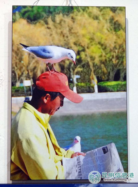 ????來(lái)自昆明本地的攝影愛(ài)好者耿忠群也參加了本次作品征集活動(dòng),他的作品《我也瞧瞧》成功入圍優(yōu)秀作品,成為展出的300余幅作品中的一員。畫(huà)面中一位老人正在看報(bào)紙,他的頭頂一只海鷗伸長(zhǎng)脖子看他手中的報(bào)紙,同時(shí)他的左手邊還有一只海鷗也好奇地望向他手中的報(bào)紙,畫(huà)面非常溫馨和諧。耿忠群說(shuō):“這幅作品是我在世博園拍的,畫(huà)面中這個(gè)老人常常帶小魚(yú)去喂海鷗,喂了4年了,他和那些海鷗有很深的感情,海鷗很愿意親近他。”