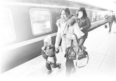 1月24日,在河北省邯鄲火車(chē)站,“小候鳥(niǎo)”和父母?jìng)兗磳⑻ど戏掂l(xiāng)的列車(chē)。郝群英攝(人民視覺(jué))