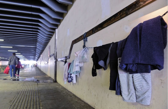 ????“北站隧道的愛(ài)心墻,是有天晚上突然出現(xiàn)的?!痹谒淼栏浇顜づ窬幼〉睦鲜f(shuō),沒(méi)看見(jiàn)是誰(shuí)設(shè)立的愛(ài)心墻,但從墻上掛著的衣物,他猜測(cè)是周邊好心人做的。隧道自南向北的人行道邊,集聚著20余頂帳篷。周邊鍋碗瓢盆和掃把分隔出不同的生活空間。老石等人白天外出務(wù)工或撿拾垃圾,晚上又回到帳篷。