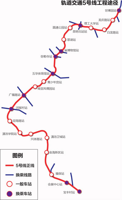 ????昆明軌道五號(hào)線(xiàn)設(shè)22站 北起世博園站南至寶豐村站